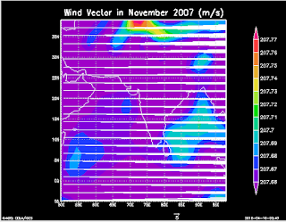 Pola sirkulasi angin permukaan di atas perairan Samudera Hindia rata-rata bulan Nopember diperlihatkan pada Gambar 2. Di atas perairan antara 5° LU-2,5 LS dan 57,5° BT–100° BT angin bergerak ke arah timur dengan kecepatan sekitar 2,2 m/dt. Di belahan bumi bagian selatan antara 7,5° LS-20° LS dan 30° BT–100 BT secara umum angin bergerak ke arah barat dan barat laut dengan kecepatan sekitar 6,4 m/dt.